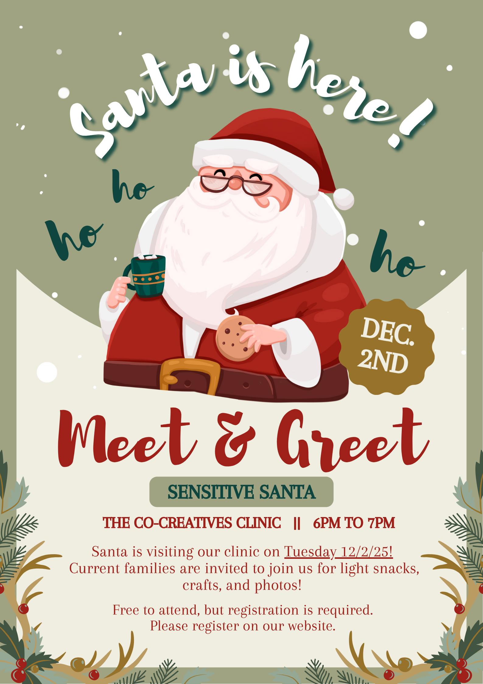 Our families are invited to meet Santa in the comfort of our clinic! Bring your family and your camera to take photos with Santa!